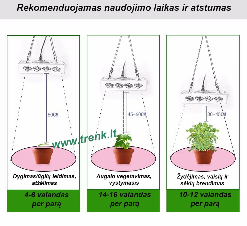 - LED: 32 vnt. 660nm Raudoni + 9 vnt. 630nm Raudoni + 19 vnt. 450nm violetiniai