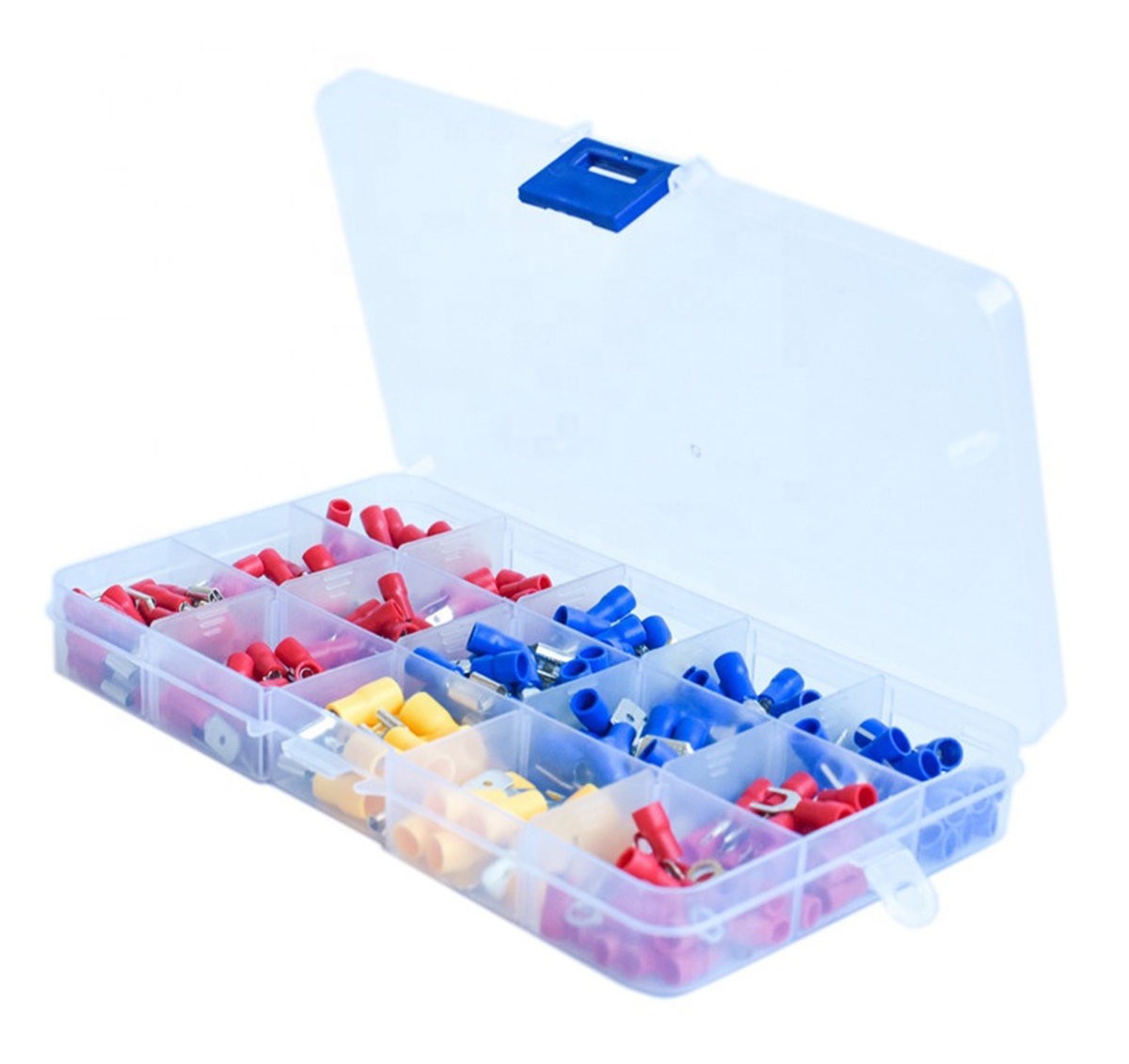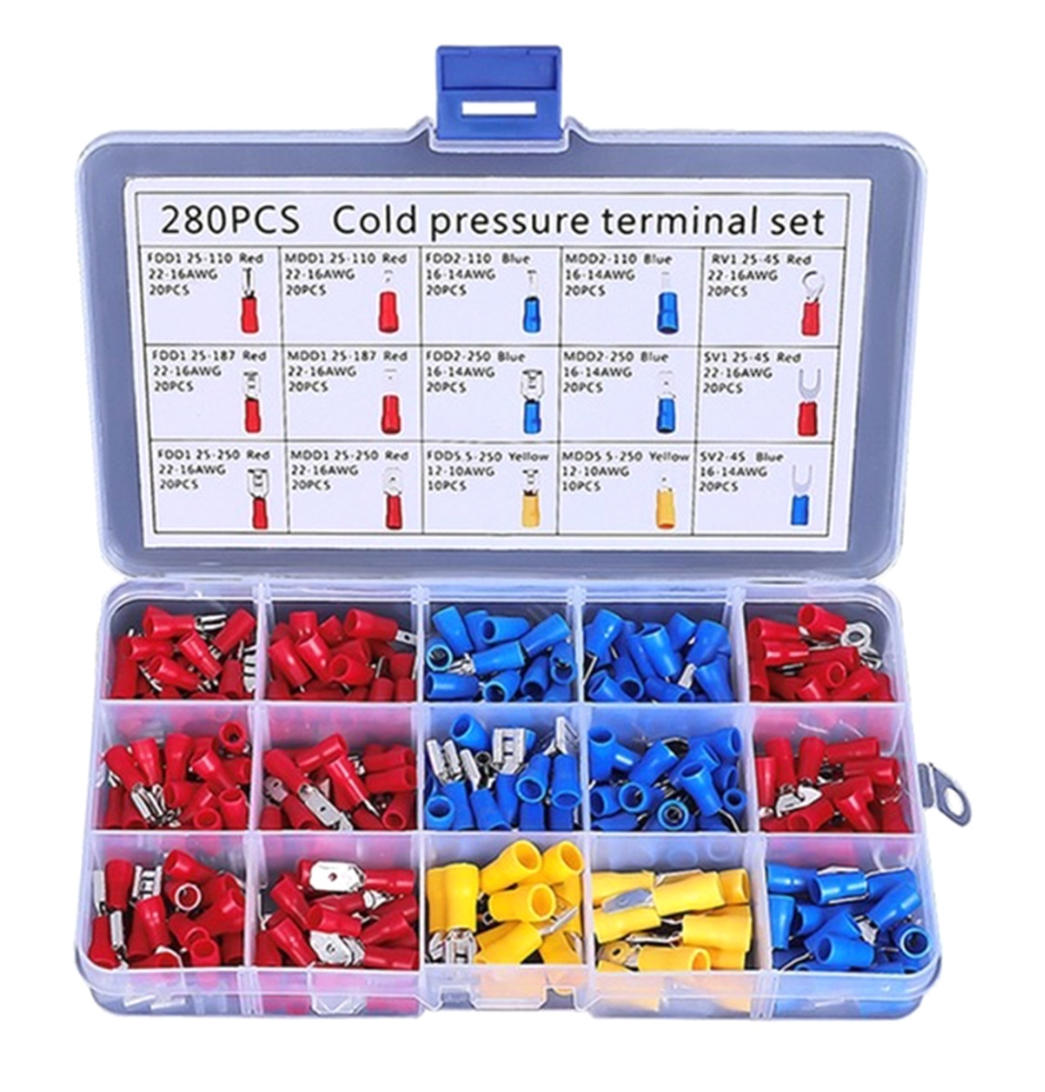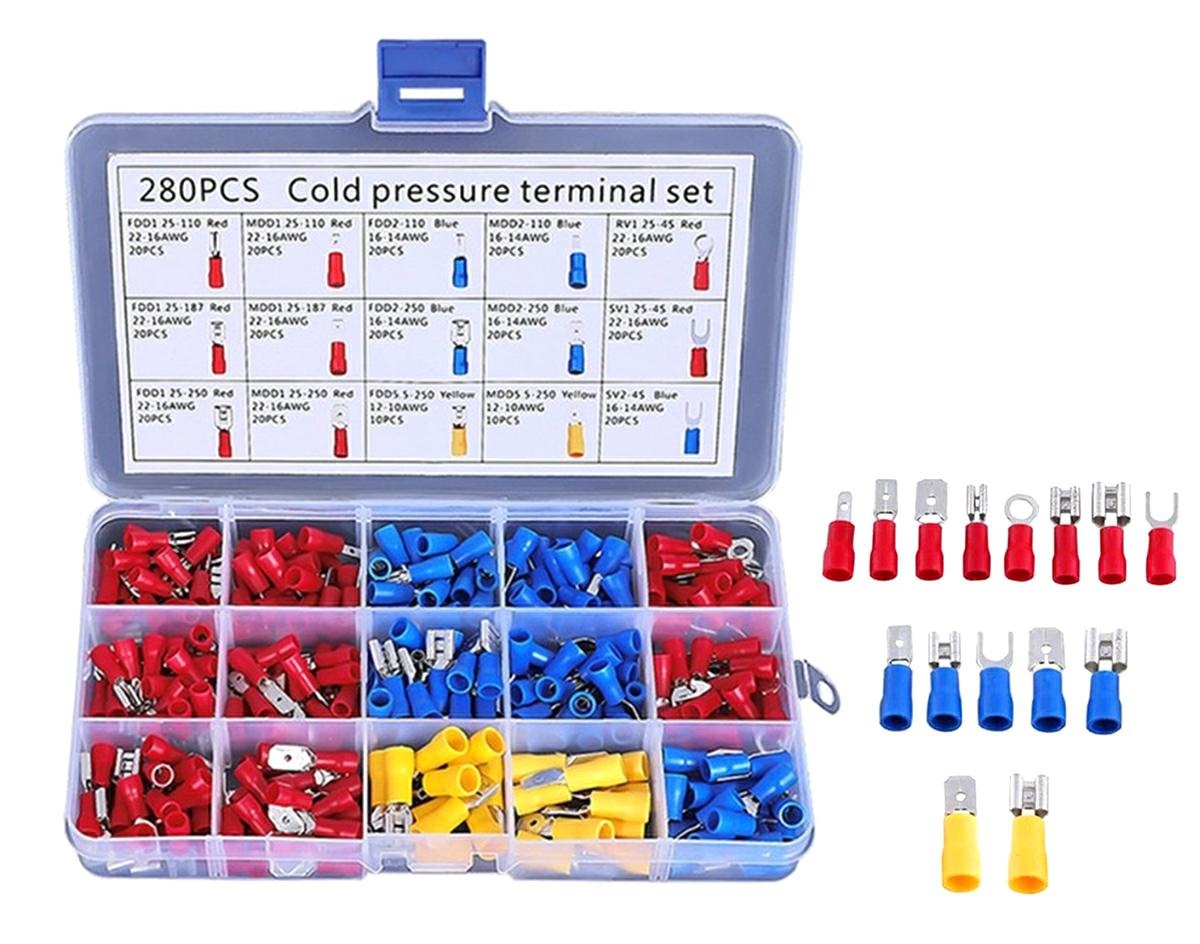280 izoliuotų užspaudžiamų jungčių rinkinys. Komplekte yra 15 tipų jungčių, surūšiuotų į atskiras kameras. Patogus, kompaktiškas dėklas su skyreliais neleidžia varžtams susimaišyti. Visos korpuso kameros yra pasirašytos, todėl nesunku rasti tinkamą jungtį. Jungtys apsaugo nuo pernelyg didelio kabelių lenkimo ir jų korozijos bei užtikrina gerą izoliaciją.