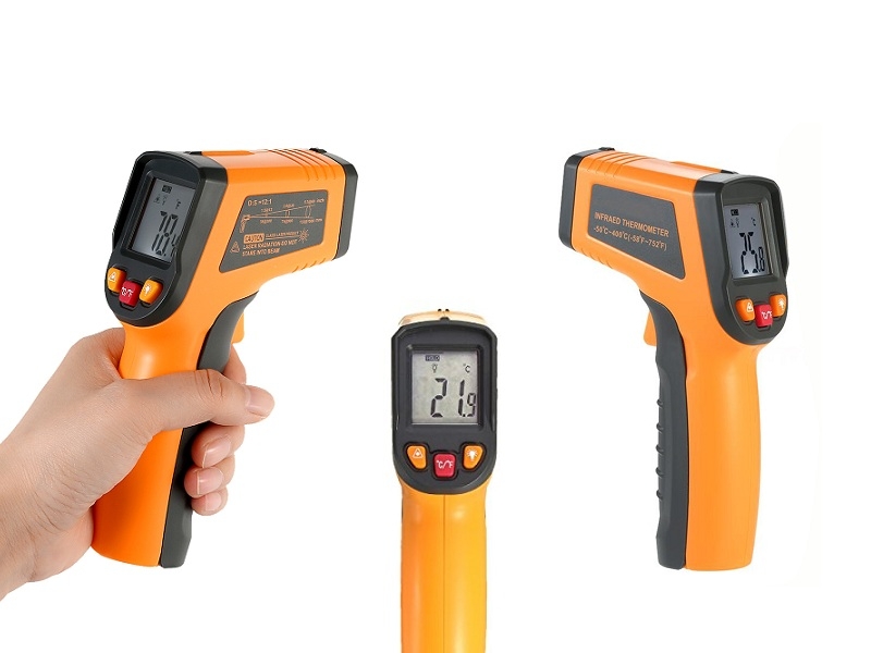 Nekontaktinis nuotolinis termometras, veikiantis infraraudonųjų spindulių principu su lazeriniu taikikliu ir LCD ekranėliu. Temperatūros parodymai mažiau nei per 1 s nuo -50 iki 400°C laipsnių.