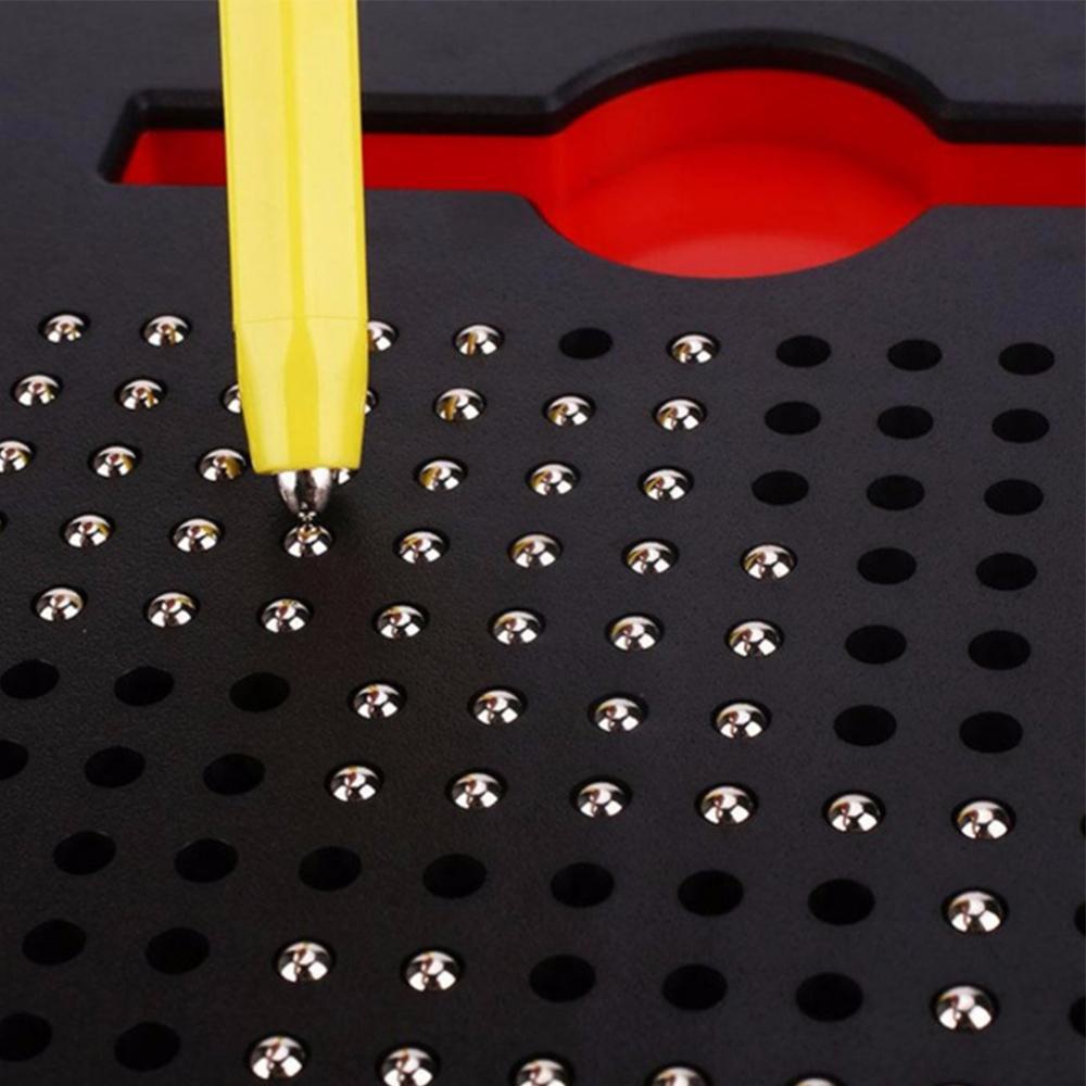 Judindami įmagnetintą rašiklio galiuką virš lentos skylių, rutuliai nusėda ir sudaro piešinį.