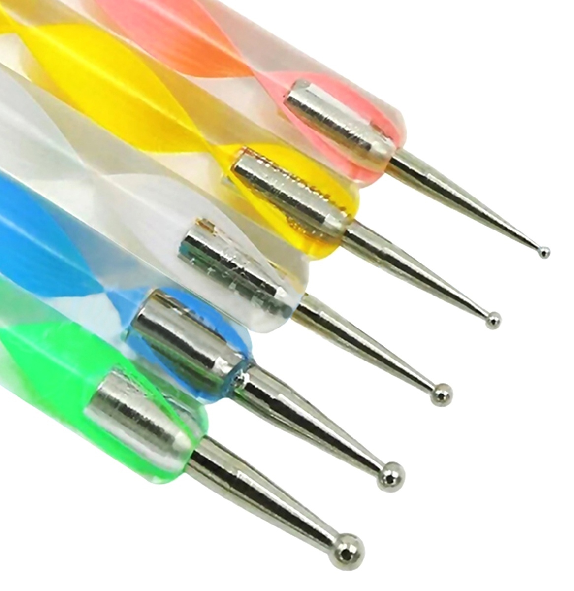 - 5x dvipusiai nagų dailės taškuokliai (įvairių spalvų).