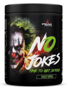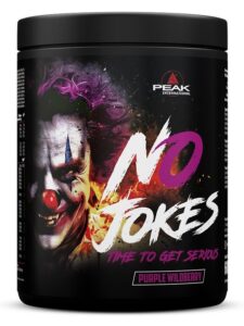 Peak No Jokes – budrumas, dėmesys, pompa ir ištvermė – jokių pokštų. Vienas rimčiausių prieštreniruotinių produktų. Be kreatino, su augaliniais ekstraktais. Įdėta daug kofeino – 532 mg/ porcijoje!