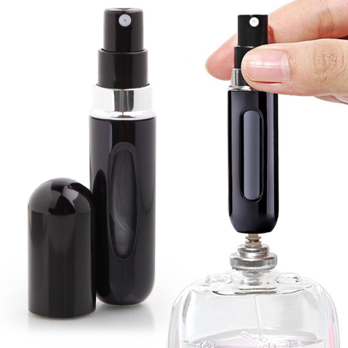 Nuo kvepalų buteliuko nuimkite purkštuko galvutę. Uždėkite flakoną ant kvepalų buteliuko ir lengvai spustelėkite žemyn kelis kartus, kol flakonas užsipildys. Neperpildykite!
