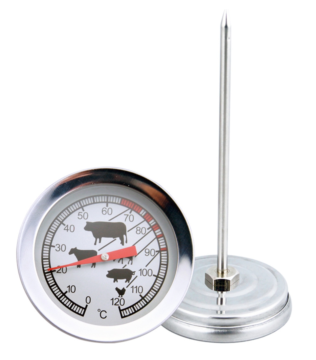 Tvirtas, plieninis analoginis termometras su patogiu segtuku, leidžiančiu pritvirtinti prie indo krašto. Puikiai tinka grilio, rūkyklos, kumpio viryklės, dujinių ir elektrinių orkaičių temperatūrai reguliuoti. Nepamainomas įrankis, kai orkaitėje nėra įmontuoto temperatūros indikatoriaus.